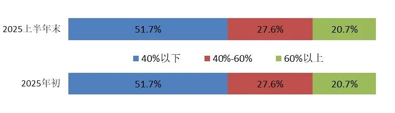 资产负债率较年初增长的有30家,占比51.7%。资产负债率超过70%的,年初有8家,上半年末降至6家。期末资产负债率的最高值为91.2%,无超过100%的情况。资产负债率分布情况见图1。