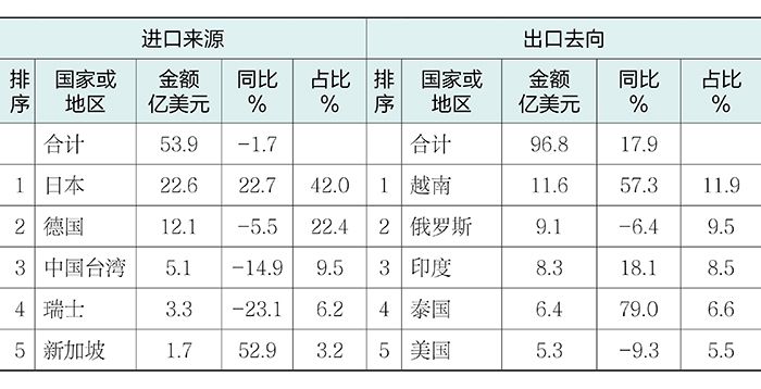 机床工具产品进口来源和出口去向排名前五的情况,详见表4。