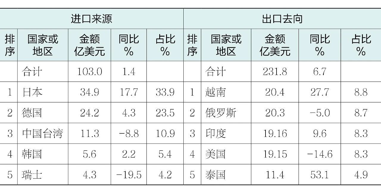 表4 2025年机床工具产品进口来源和出口去向排名前五的情况