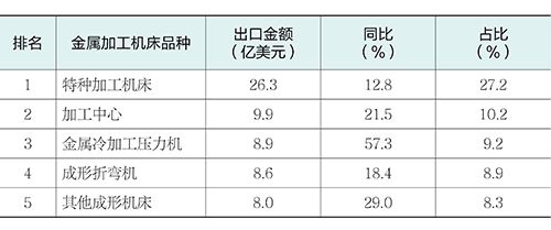 出口产品附加值提升,结构优化。机床功能部件(含零件)、加工中心、特种加工机床、齿轮加工机床、金属冷加工压力机等技术密集型产品出口额快速增长,反映出我国机床工具产品在国际市场的竞争力不断加强。