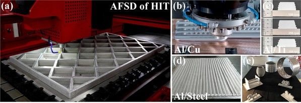 “搅拌摩擦沉积Al/Zr基非晶复合材料”制备方法。该方法通过自主研发的搅拌摩擦沉积(AFSD)技术,在保持金属玻璃非晶稳定性的同时,显著提升界面承载能力,界面剪切强度达到187MPa(较优化前提升65.5%)。该研究为下一代可折叠手机铰链等关键轻量化部件提供了全新材料结构设计与制造方案,对铝/钛、铝/镁等异种金属复合材料具有推广价值。